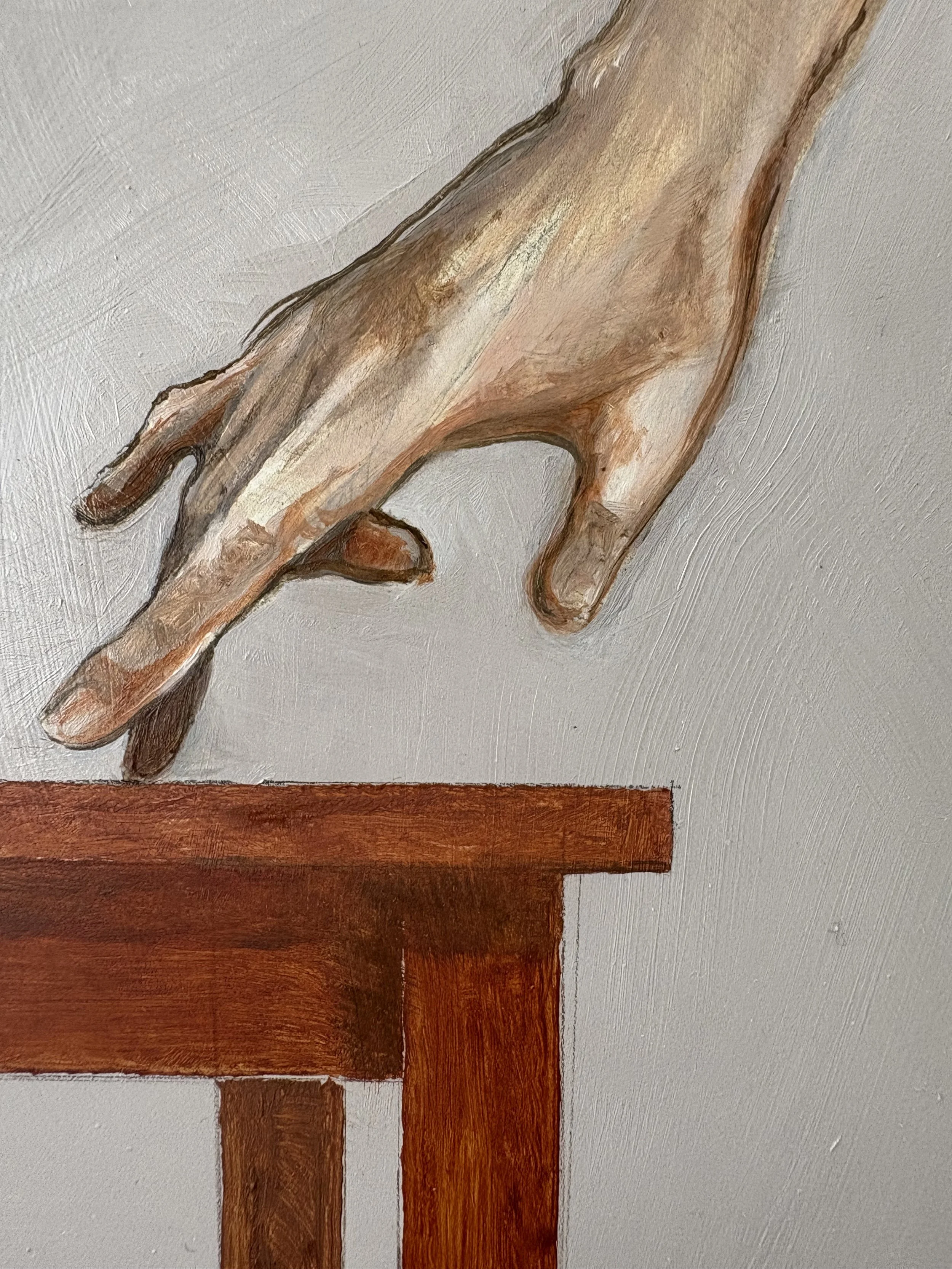 This piece haunted me. Continuing to seek some kind of just perfect piece, I found myself growing increasingly distant from the work. When I returned to the piece after 4 months away from my studio, I completed it in 10 days. That strange self-consciousness fled and the work just flowed. Difficult issues like the trailing hand worked themselves out. The addition of the small table was an afterthought. I feel it connects the figure to a sense of place, grounding it in the moment.